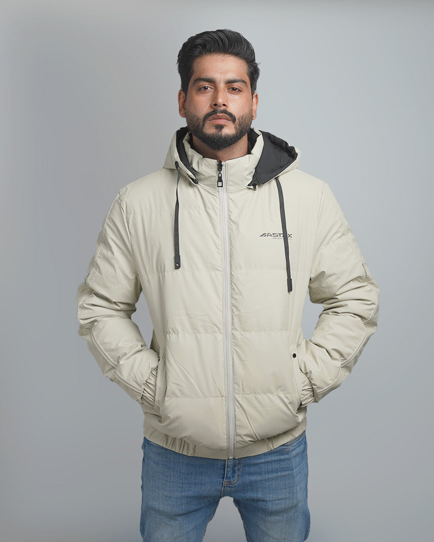 Gear up for the cold with this men's insulated hooded puffer jacket. Built for warmth without the bulk, this jacket features a lightweight, padded design and an attached hood with a contrast lining for a modern finish. Practical elements include a full-zip closure, zippered pockets, and elasticated details at the hem and cuffs, making it a comfortable, everyday essential for chilly weather.